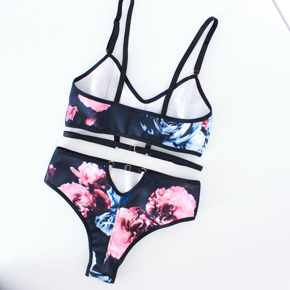 Ready to ship, size 32B, UK 8. This set is made from a dark floral scuba fabric with navy panels and ruffle edges, soft black edging elastic, black satin strap elastic and gold metal hardware. The bralet is cut in a longline cami style with a strappy underbust, and the bottoms are cut in a mid rise tanga with keyhole back.